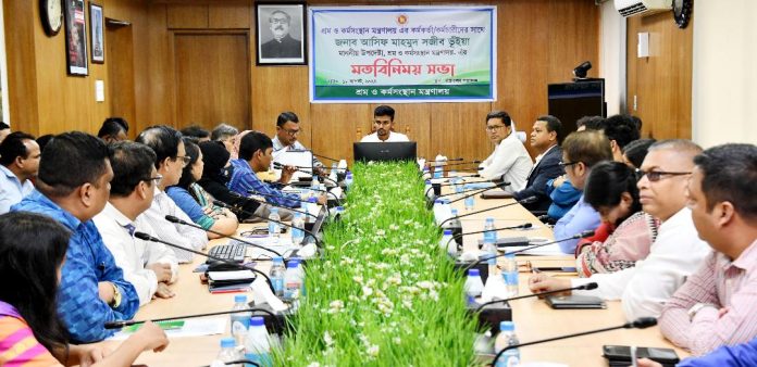 শ্রম ও কর্মসংস্থান মন্ত্রণালয়ের সচিব মোঃ মাহবুব হোসেনের সভাপতিত্বে অনুষ্ঠিত মতবিনিময় সভায় মন্ত্রণালয় ও অধীন দপ্তরের উর্ধ্বতন কর্মকর্তাগণ উপস্থিত ছিলেন।