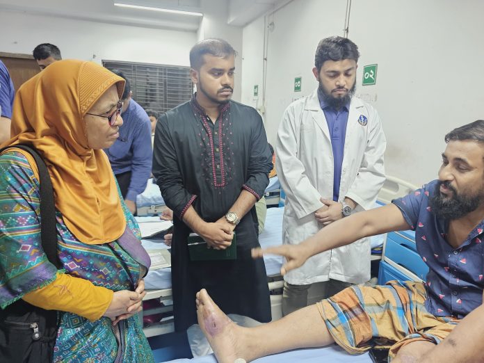 স্বাস্থ্য উপদেষ্টা আরো বলেন, অনেকে পায়ে আঘাত পেয়েছেন, অনেকের পা কেটে ফেলতে হয়েছে। আমরা বিভিন্ন দাতা সংস্থার সাথে কথা বলছি, বিশ্বব্যাংকের সাথেও আমাদের কথা হয়েছে। যাতে সুচিকিৎসার জন্য বিদেশ থেকে ডাক্তারদের টিম নিয়ে আসা যায়। সেটা নিয়ে আমরা চেষ্টা করে যাচ্ছি।