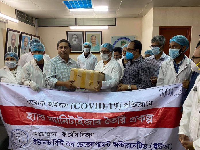 স্যানিটাইজার প্রদান করা হয়। বঙ্গবন্ধু শেখ মুজিব মেডিকেল বিশ্ববিদ্যালয় এর লিভার বিভাগের সম্মানিত চেয়ারম্যান অধ্যাপক ডাঃ মামুন আল মাহতাব হ্যান্ড স্যানিটাইজার গুলো চিকিৎসক দের পক্ষ থেকে গ্রহন করেন। এ সময় উপস্থিত ছিলেন ইউনিভার্সিটি অব ডেভেলপমেন্ট অল্টারনেটিভ এর প্রতিষ্ঠাতা চেয়ারম্যান জনাব মুজিব খান, রেজিস্ট্রার ড. ইফাদ চৌধুরী, ফার্মেসি অনুষদের রেজিস্ট্রার ড. আতিকুল ইসলাম, বিশ্ববিদ্যালয়ের শিক্ষক ফারহানা ইসলাম, মনির চৌধুরী, নাজমুস সাদাত, বাংলাদেশ ফার্মাসিস্টস্ ফোরাম এর সাধারন সম্পাদক ও বিশ্ববিদ্যালয়ের প্রাক্তন ছাত্র সাদেক আহম্মেদ সৈকত ও বিশ্ববিদ্যালয়ের ফার্মেসি অনুষদের ছাত্র ছাত্রীরা।