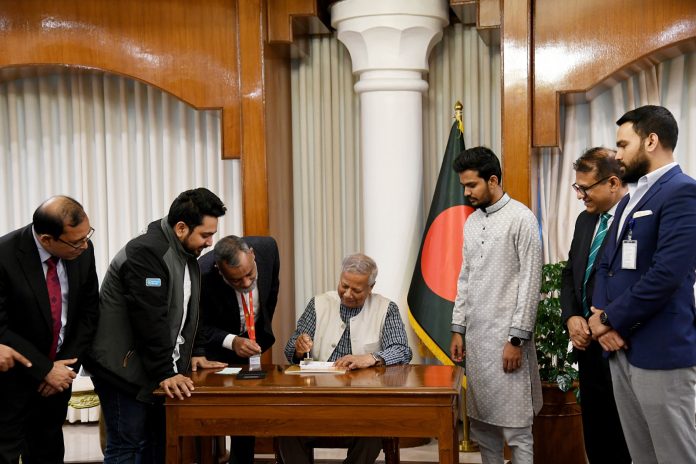 ঢাকা, ৩০ ডিসেম্বর ২০২৪: ‘এসো দেশ বদলাই, পৃথিবী বদলাই’ স্লোগানকে সামনে রেখে যুব ও ক্রীড়া মন্ত্রণালয়ের আয়োজনে এবং প্রধান উপদেষ্টার কার্যালয়ের সার্বিক তত্ত্বাবধানে আয়োজিত ‘তারুণ্যের উৎসব ২০২৫’ এর উদ্বোধনী খামে স্বাক্ষর করেছেন প্রধান উপদেষ্টা প্রফেসর মুহাম্মদ ইউনূস।