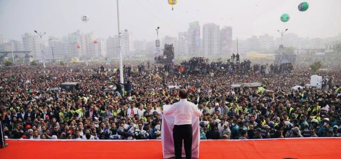 Then, a motorcade escorted Tarique Rahman’s bus to the venue as millions of people standing on the both sides of airport road bound to 300 feet welcomed him with chanting slogans.